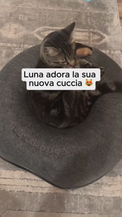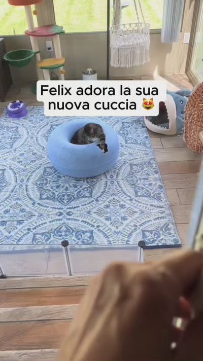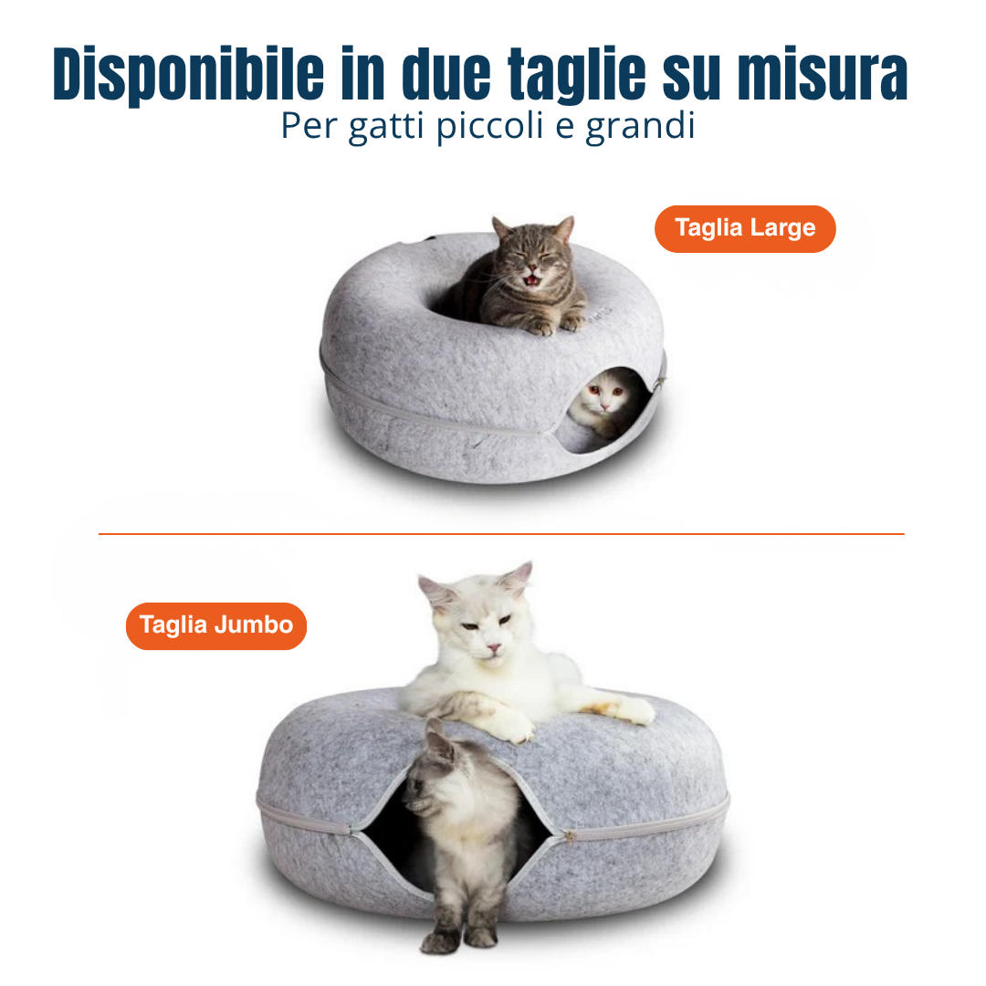 È realizzata in tessuto compresso e flessibile, termoformato in una forma a ciambella: un rifugio super accogliente in cui i gatti possono raggomitolarsi e riposare in tranquillità, oppure fare giochi di lotta con i loro amici felini.